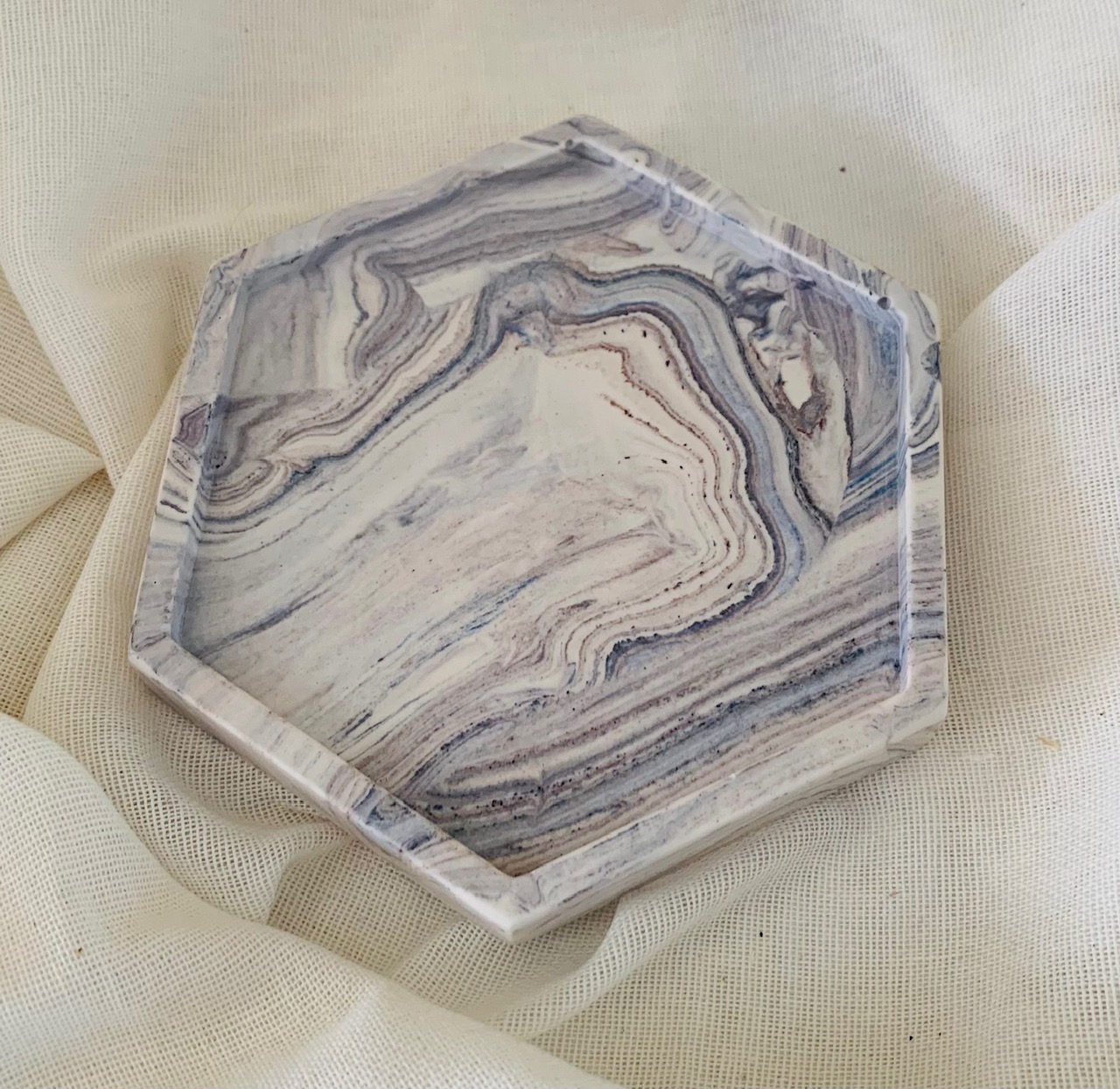 Peças em Jesmonite — bandejas, suportes e objetos decorativos.