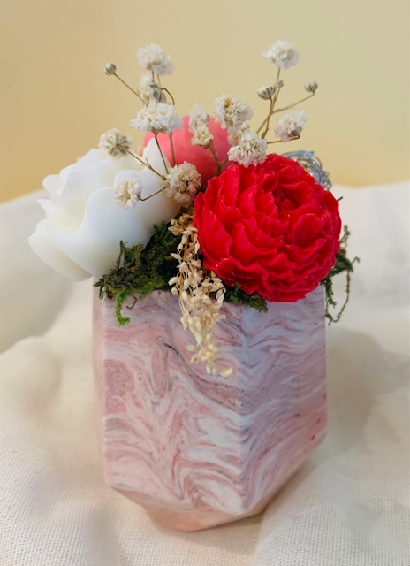 Composto por três rosas em cera de soja perfumadas com aroma de rosa, acompanhadas de flores secas e um detalhe decorativo, este arranjo transmite leveza, elegância e um toque de encanto natural.