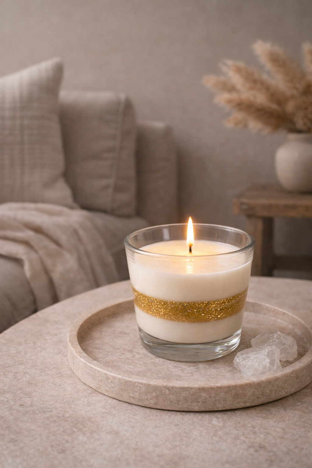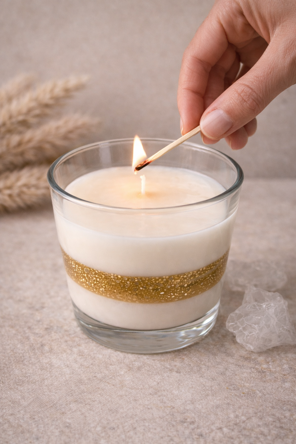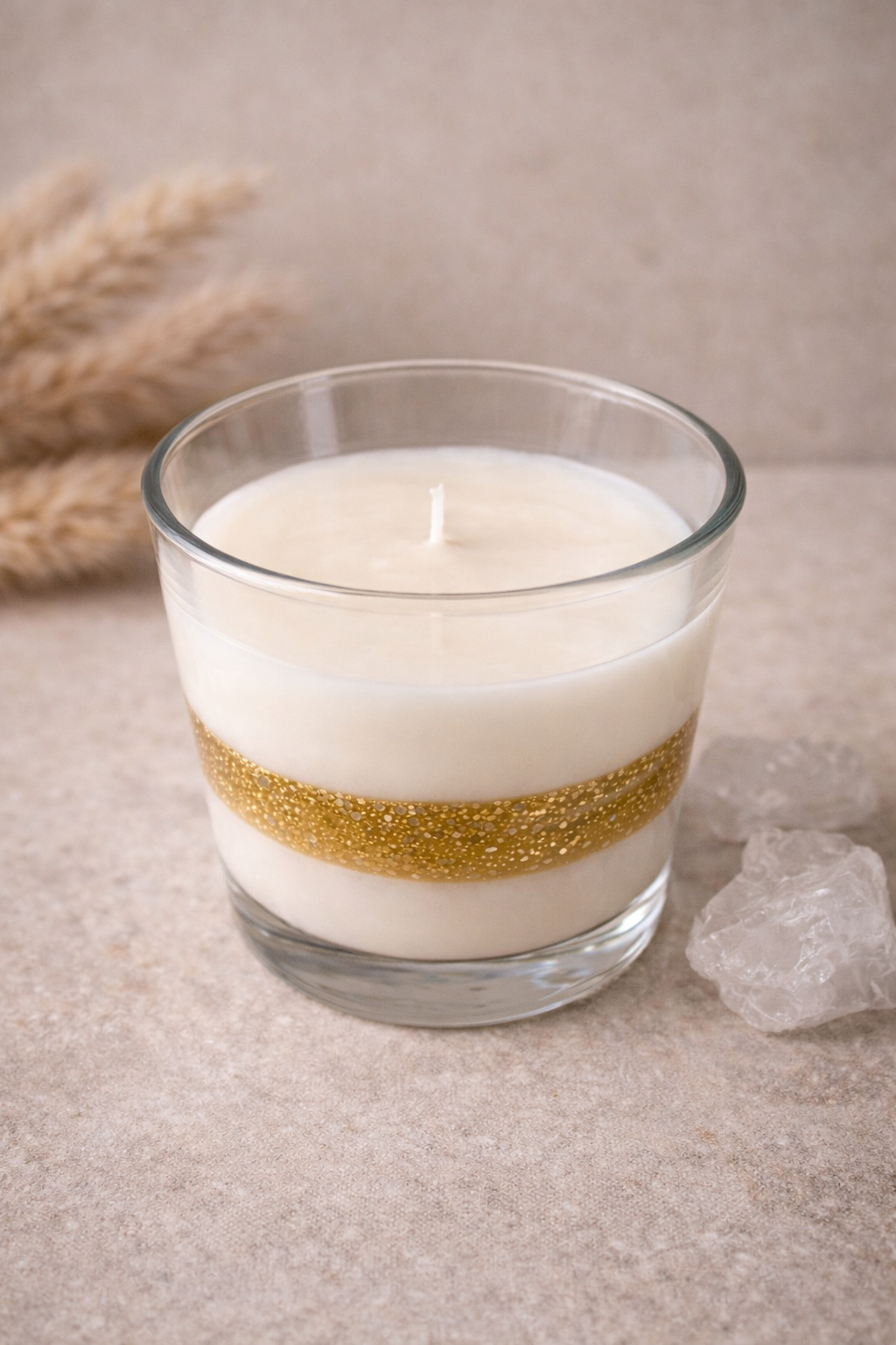 as camadas exteriores mantêm a tonalidade natural da cera, enquanto o centro em gel de parafina transparente com partículas douradas cria um efeito luminoso subtil quando a vela é acesa.