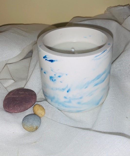 O recipiente em Jesmonite é feito à mão e decorado com delicados salpicos de azul, inspirados nas cores e no movimento das águas atlânticas.