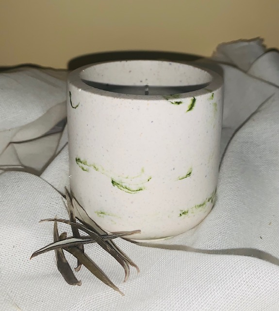 O recipiente em Jesmonite apresenta tons neutros e pequenos salpicos verdes, que evocam a ligação à natureza e ao verde que nos rodeia